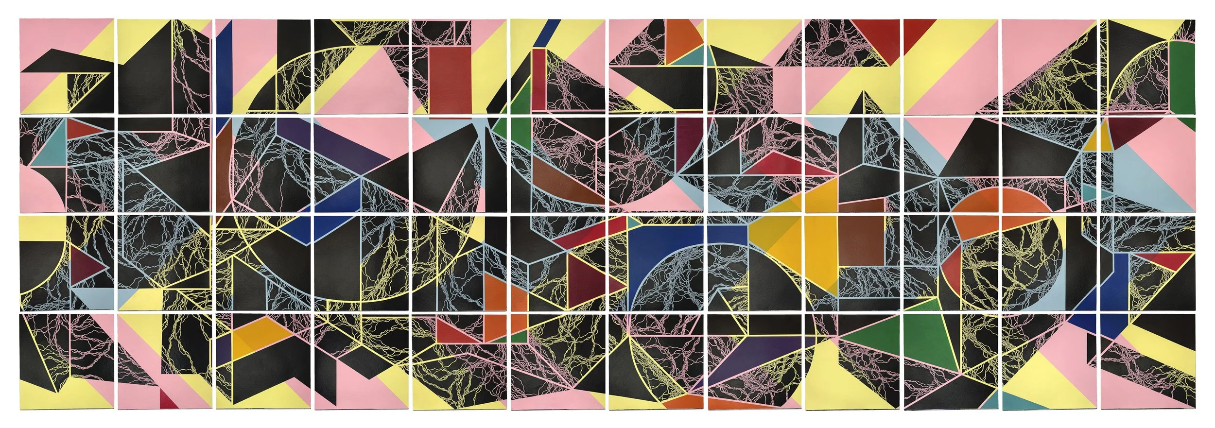 Depending on where you stand in relation to the works, your perception shifts, refutes what is actually there—flat paint on canvases. Those simple geometries may not be so clearly defined after all. They break apart and reform, take on new configurations by combining with neighboring shapes. The longer you look, the more shapes appear to fold, tilting forward one moment and dropping back the next. Even the squiggly lines shift. At a distance, they look drawn freely on black backgrounds, but up close, they become highly considered knockouts, threading bright backgrounds through and pushing the blackness behind.